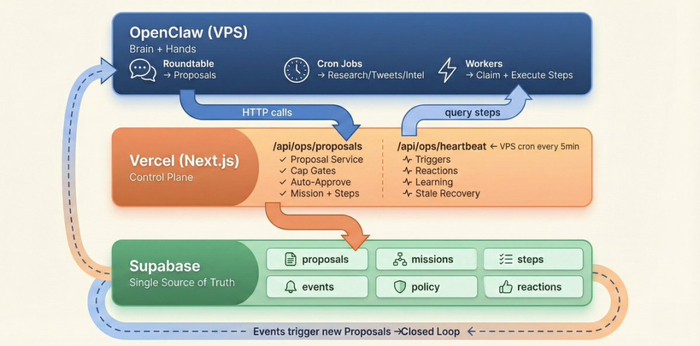- Supabase:所有状态的唯一真相来源(提案、任务、事件、记忆)