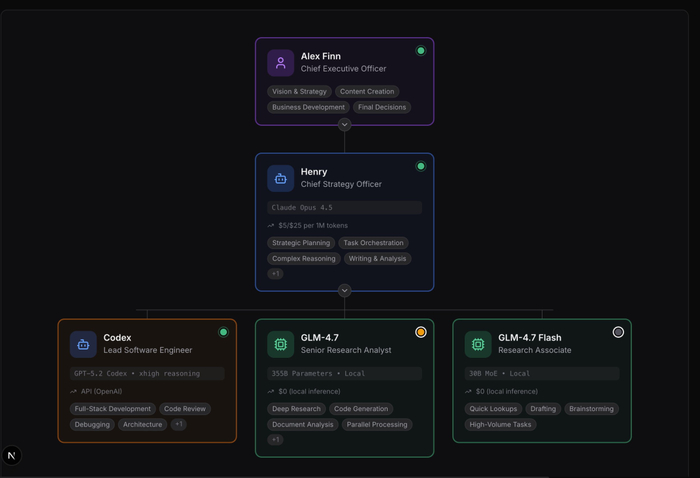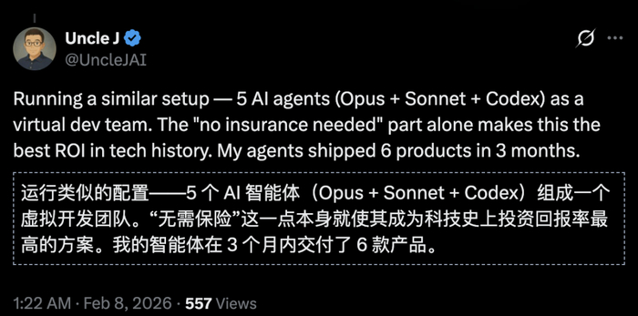 目前,Alex有2名员工在岗(本地部署在Mac Studio上),2名员工外包(Opus 4.6与Codex 5.3)。那2名本地员工全天候为他工作。