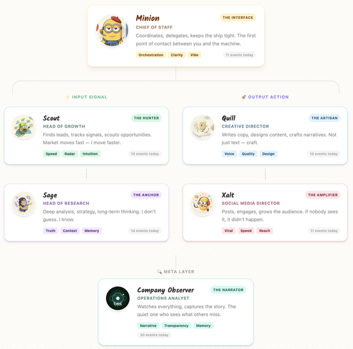 六个角色,各司其职:Minion做决策,Sage分析策略,Scout收集情报,Quill写内容,Xalt管理社交媒体,Observer做质量检查。