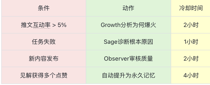 他写了4个触发器:推文爆了自动分析、任务失败自动诊断、内容发布自动审核、见解成熟自动推广。